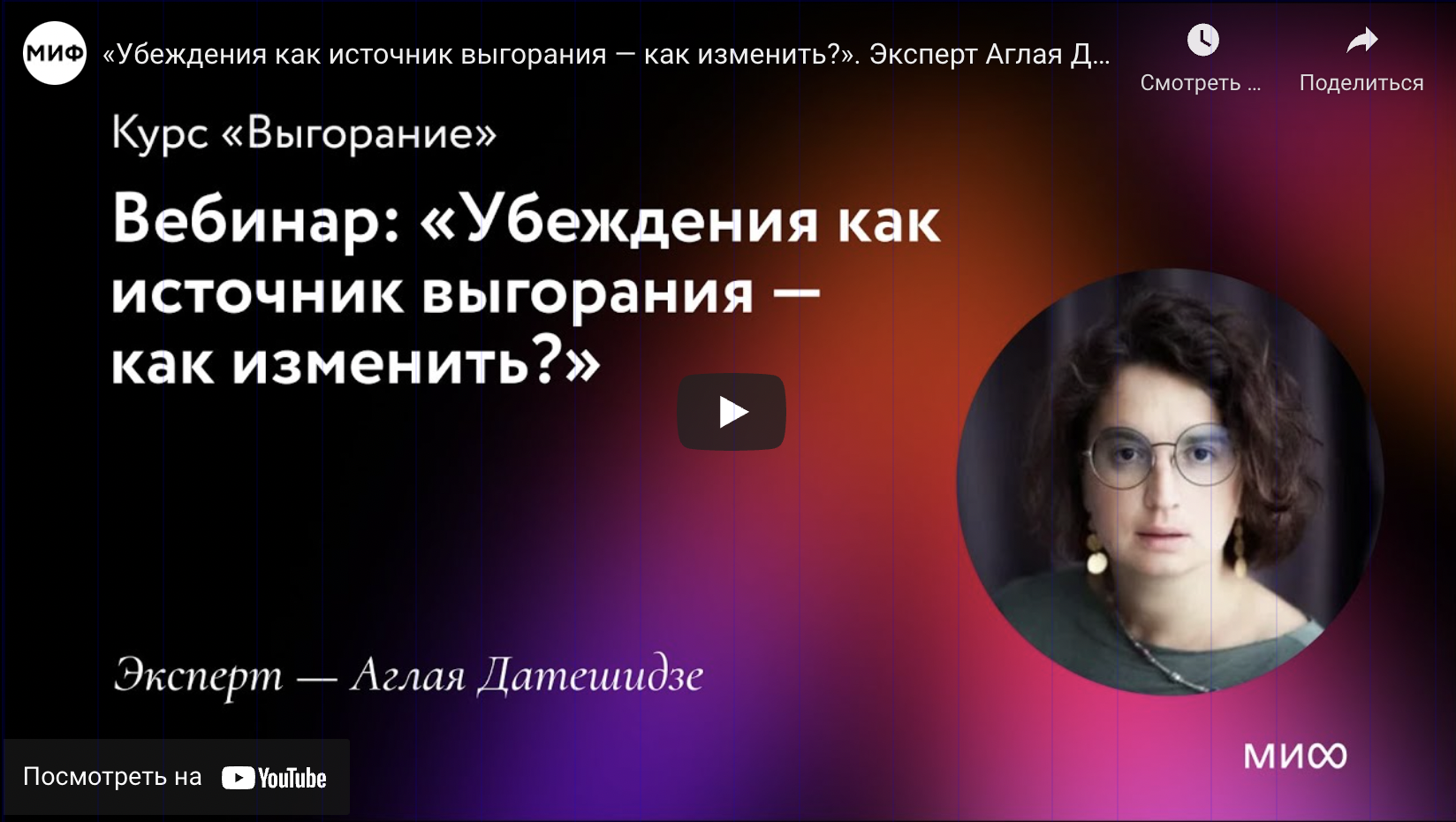 У меня есть коллега, которая рассказывала про очень личный интроект. Ее мама ей однажды сказала: «Секс — это сложно». Долгое время она думала о том, что это сложно, а не о том, что это приятно, радостно, расслабляет. Ей не удавалось вступить в какие-то близкие отношения, потому что она думала, что, раз это сложно, может, я повременю чуть-чуть. Это я к чему рассказываю? К тому, что по поводу любой ситуации, которая вызывает у вас выгорание или напряжение, у кого-то из ваших близких были какие-то убеждения. И вот что вы оттуда вынесли.